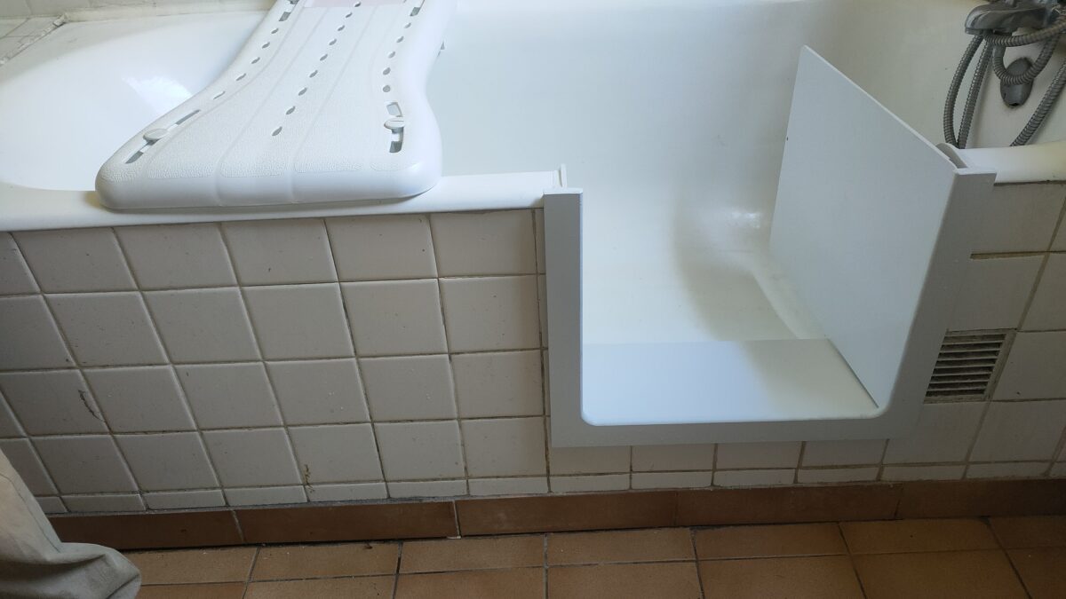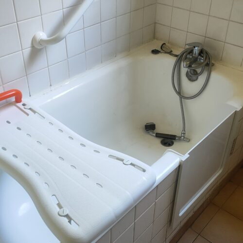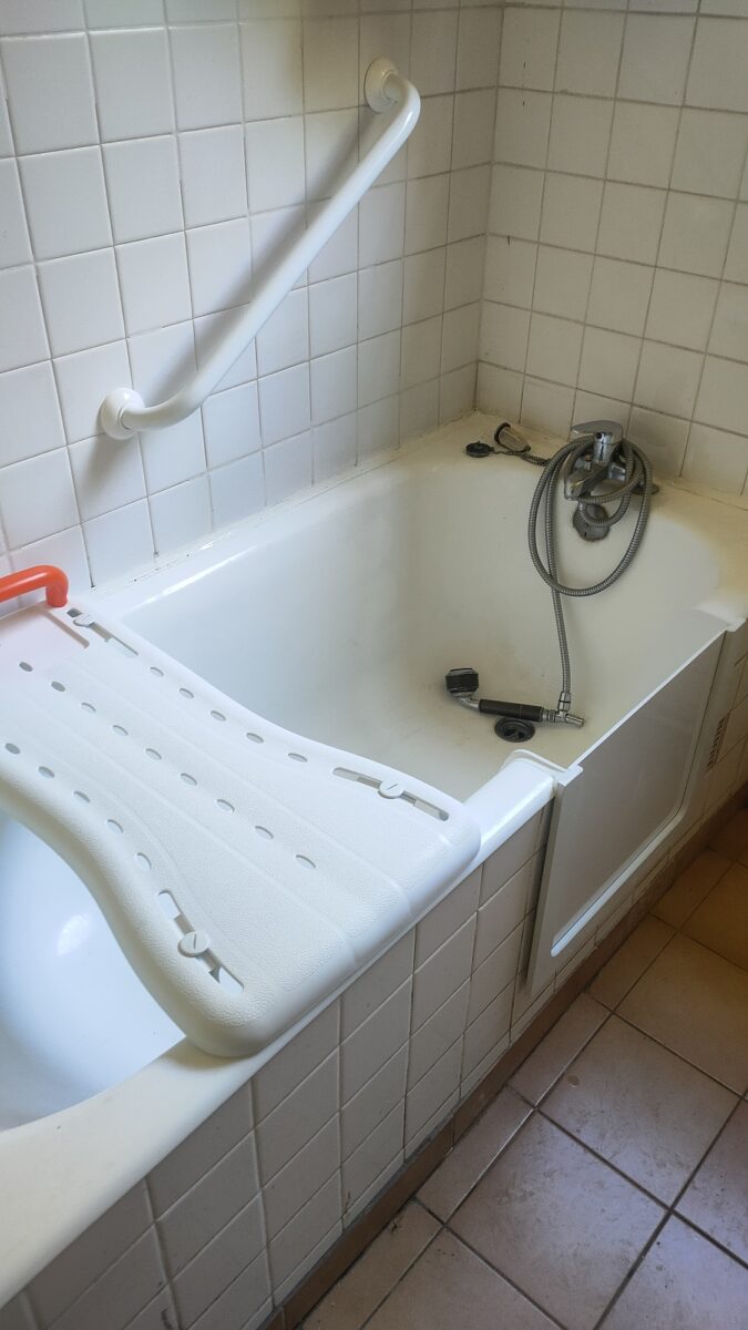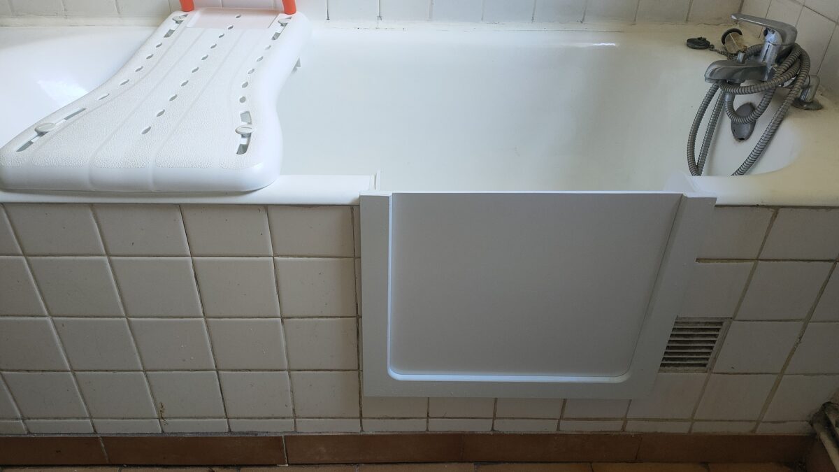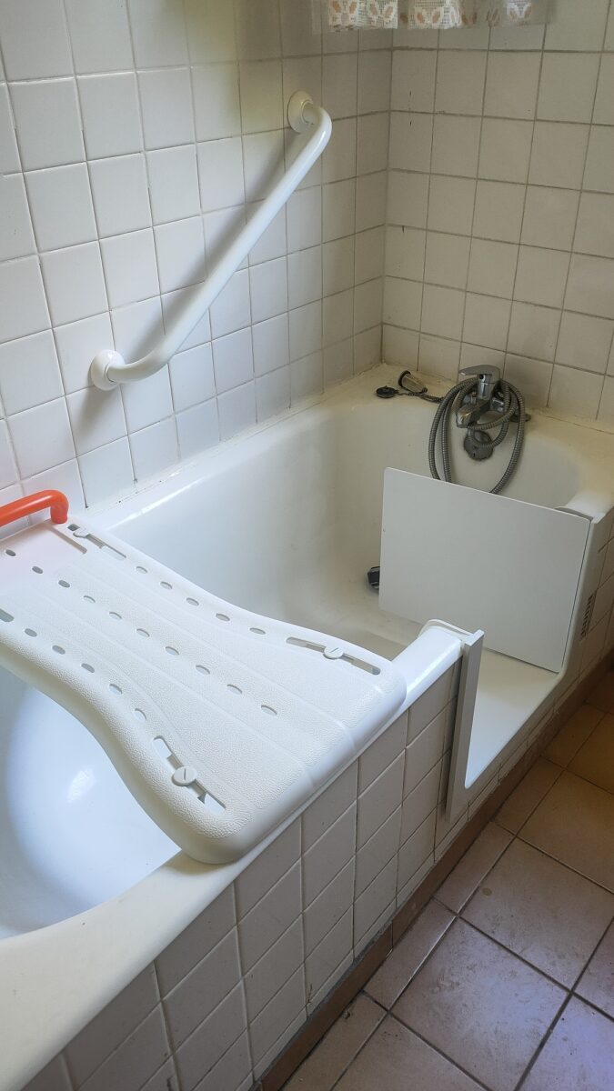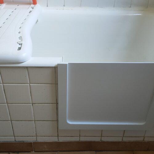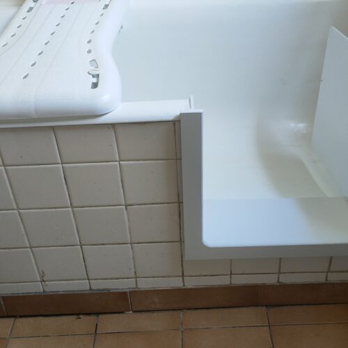 Réalisation d’une découpe sur une baignoire en fonte. Installation d’un portillon en option.