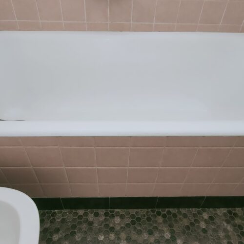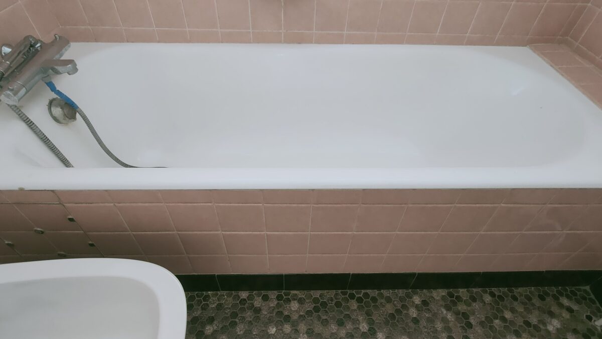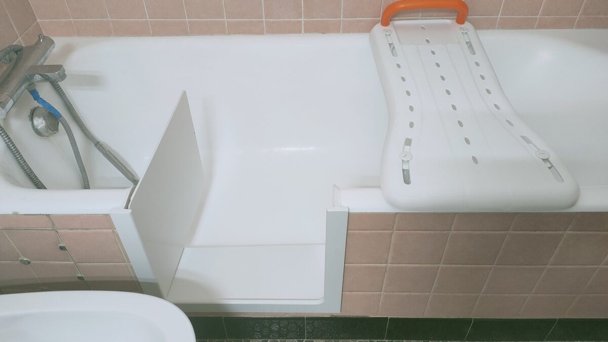 Réalisation d’une découpe sur une baignoire en fonte. Un portillon anti-éclaboussures a été installé en option.