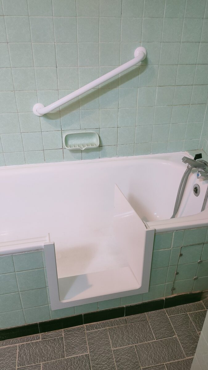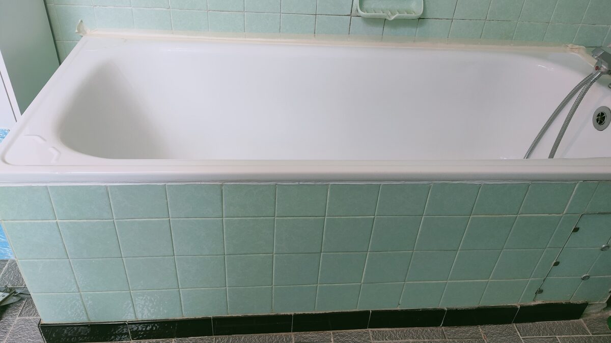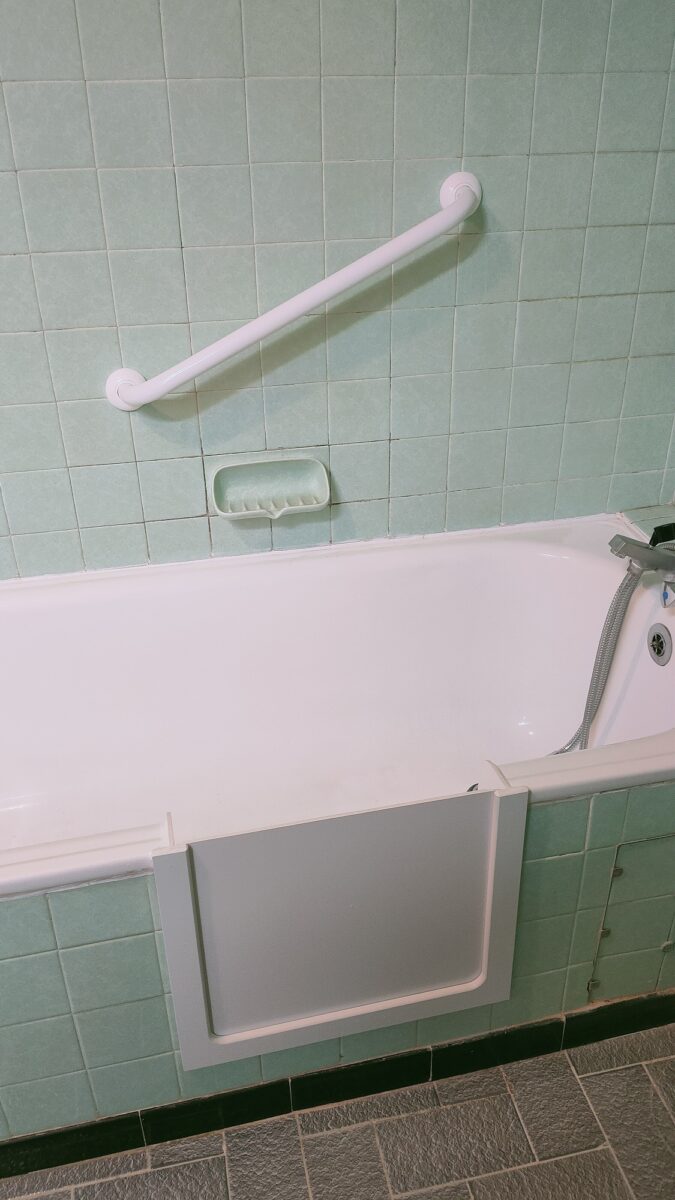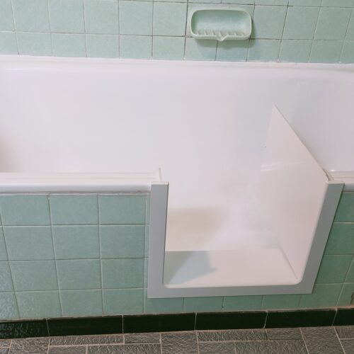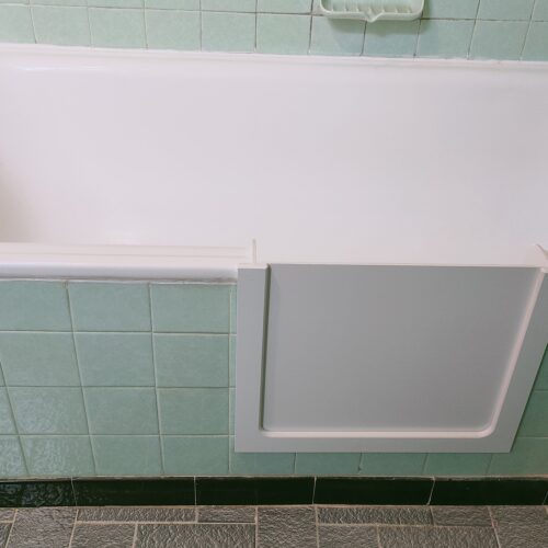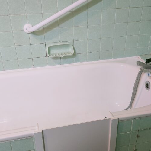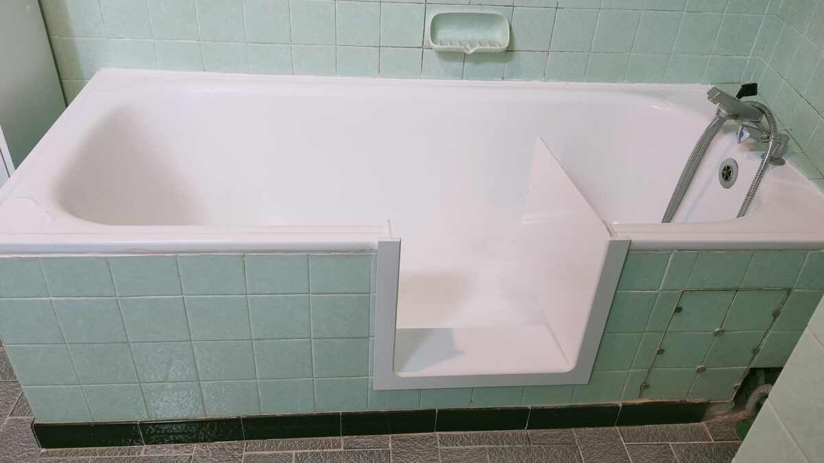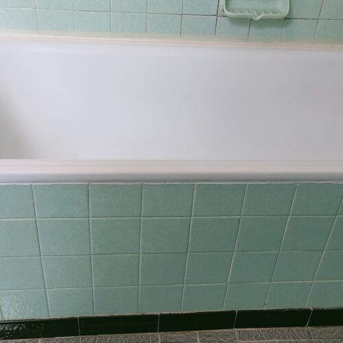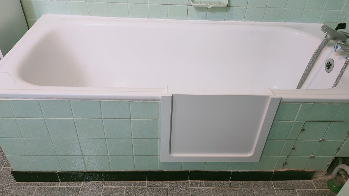 Réalisation d’une découpe sur une baignoire en fonte. Installation d’un portillon anti-éclaboussures.