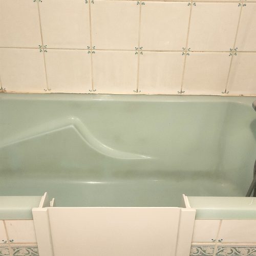 Réalisation d’une découpe sur une baignoire acrylique, avec un portillon anti-éclaboussures en option.