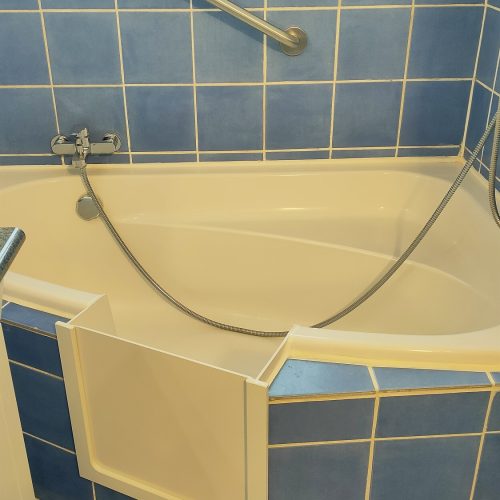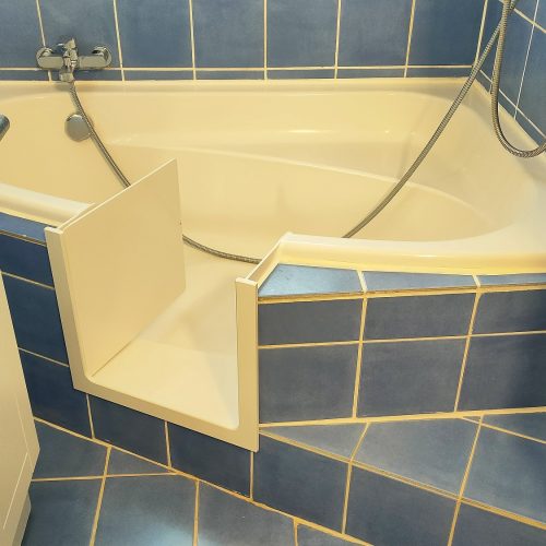Réalisation d’une découpe sur une baignoire acrylique. Pose d’un portillon anti-éclaboussures.